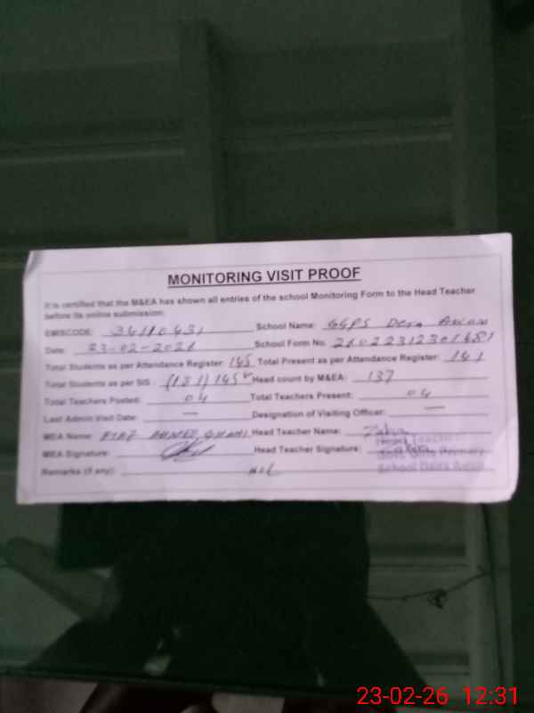 | Attendance Register | Head Teacher | MEA with School | Visit Proof |