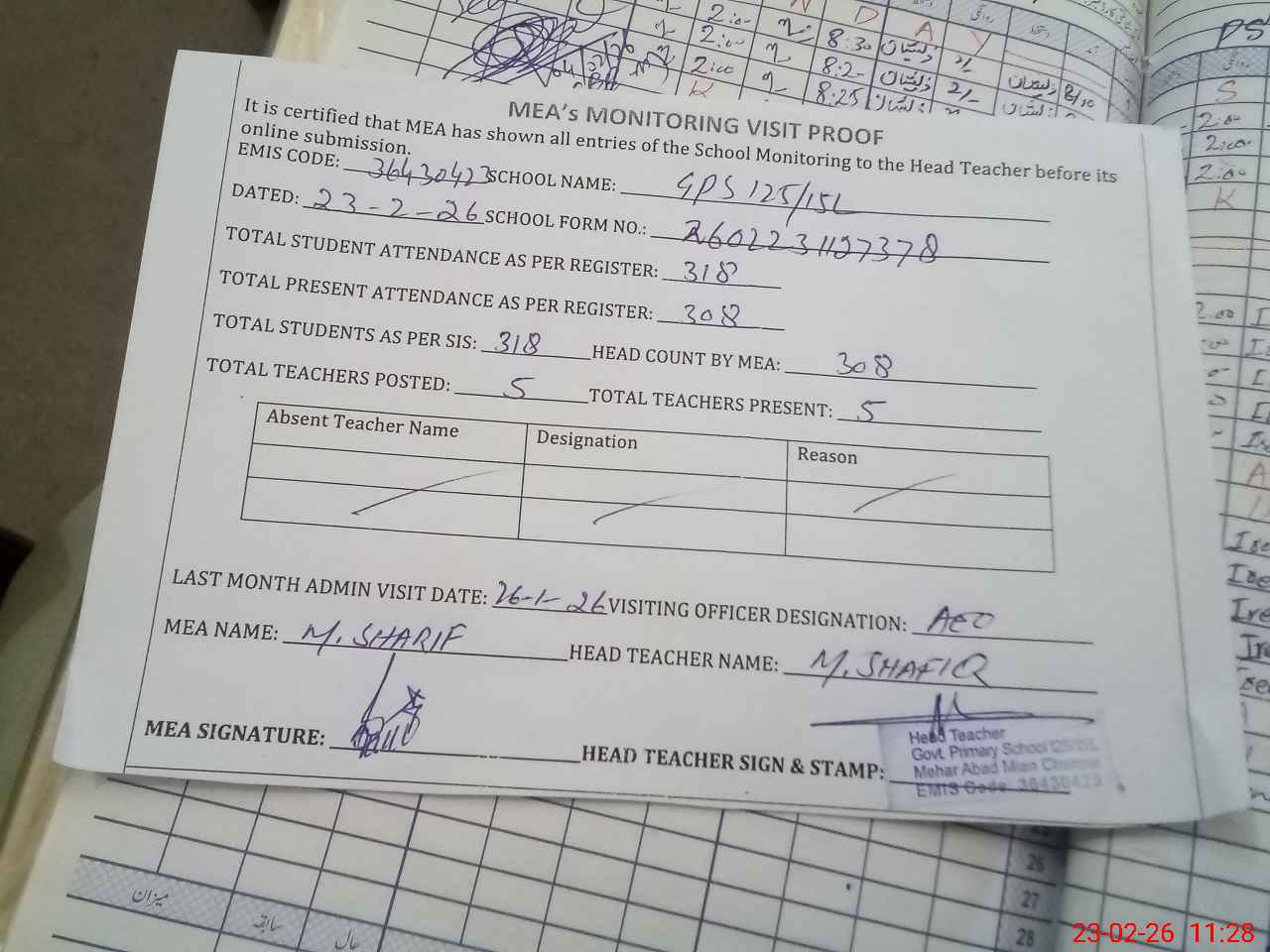 | Attendance Register | Head Teacher | MEA with School | Visit Proof |