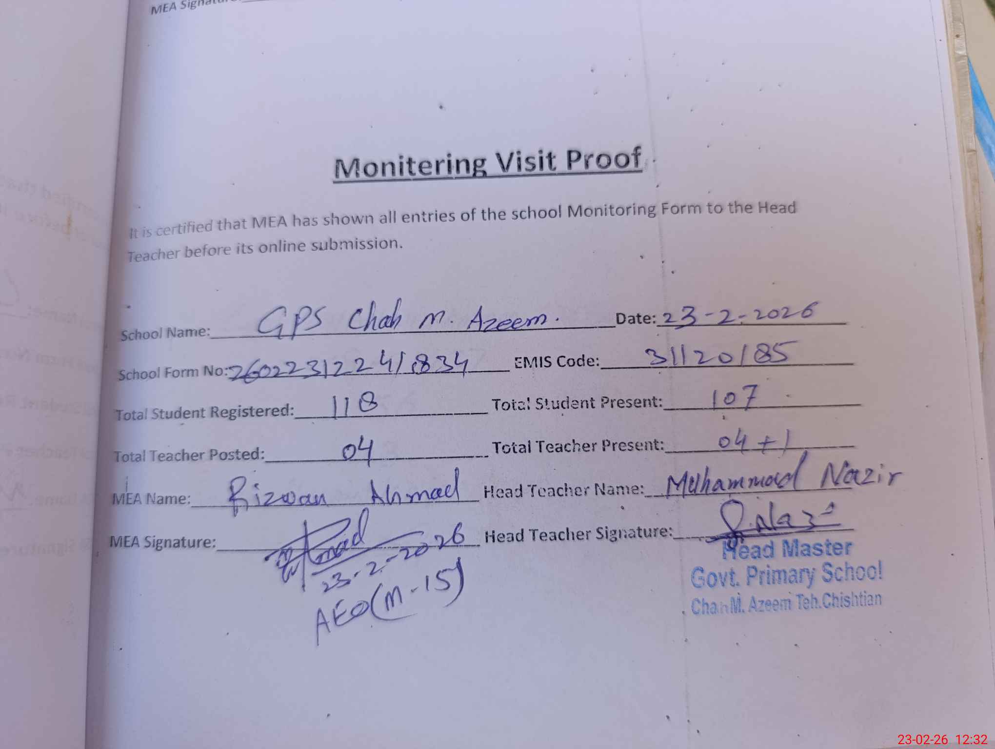 | EMIS Code: 31120185 | Name of School: GPS CHAH MUHAMMAD AZEEM | |||
