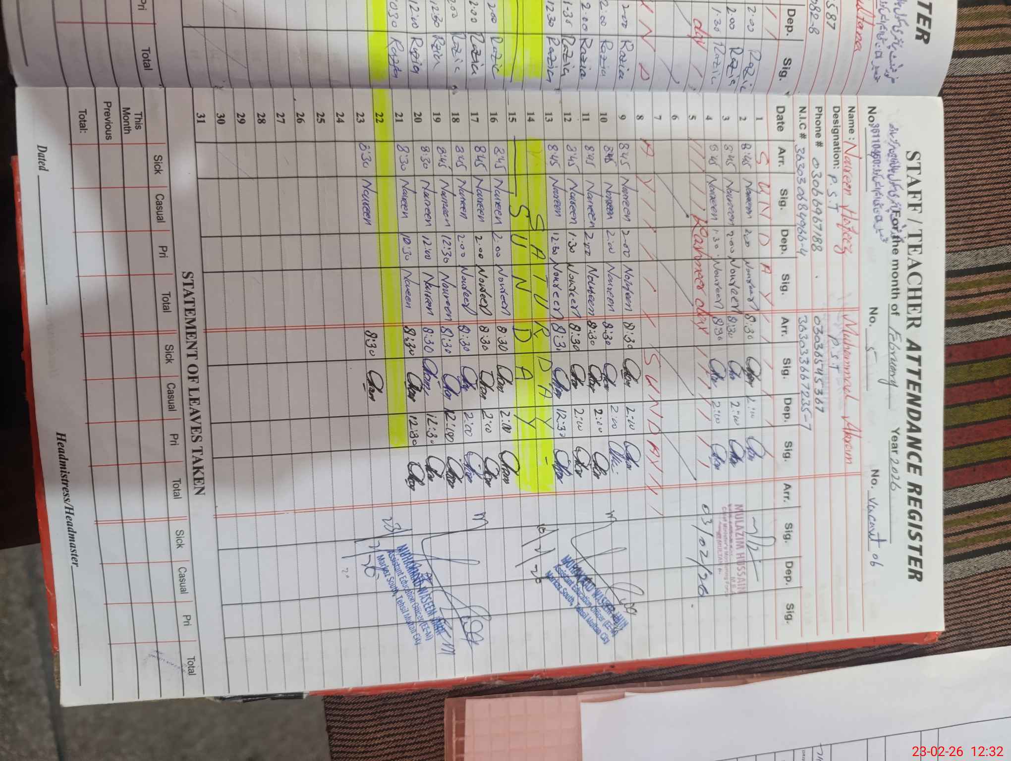 | CNIC | Full Name | Designation | R/C | Absence During Last Calender Month |