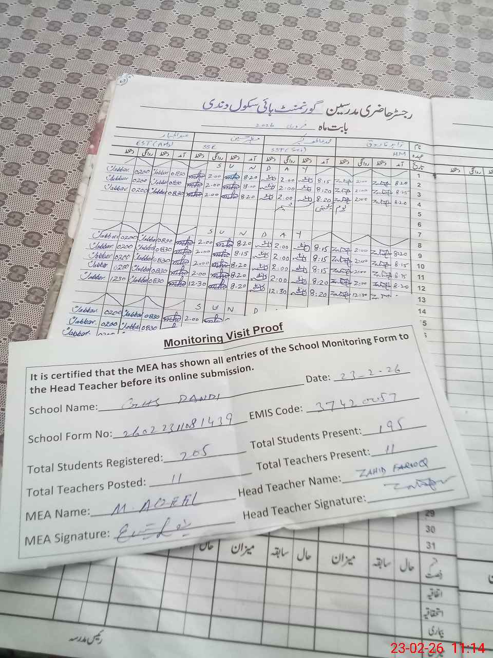 | Attendance Register | Head Teacher | MEA with School | Visit Proof |