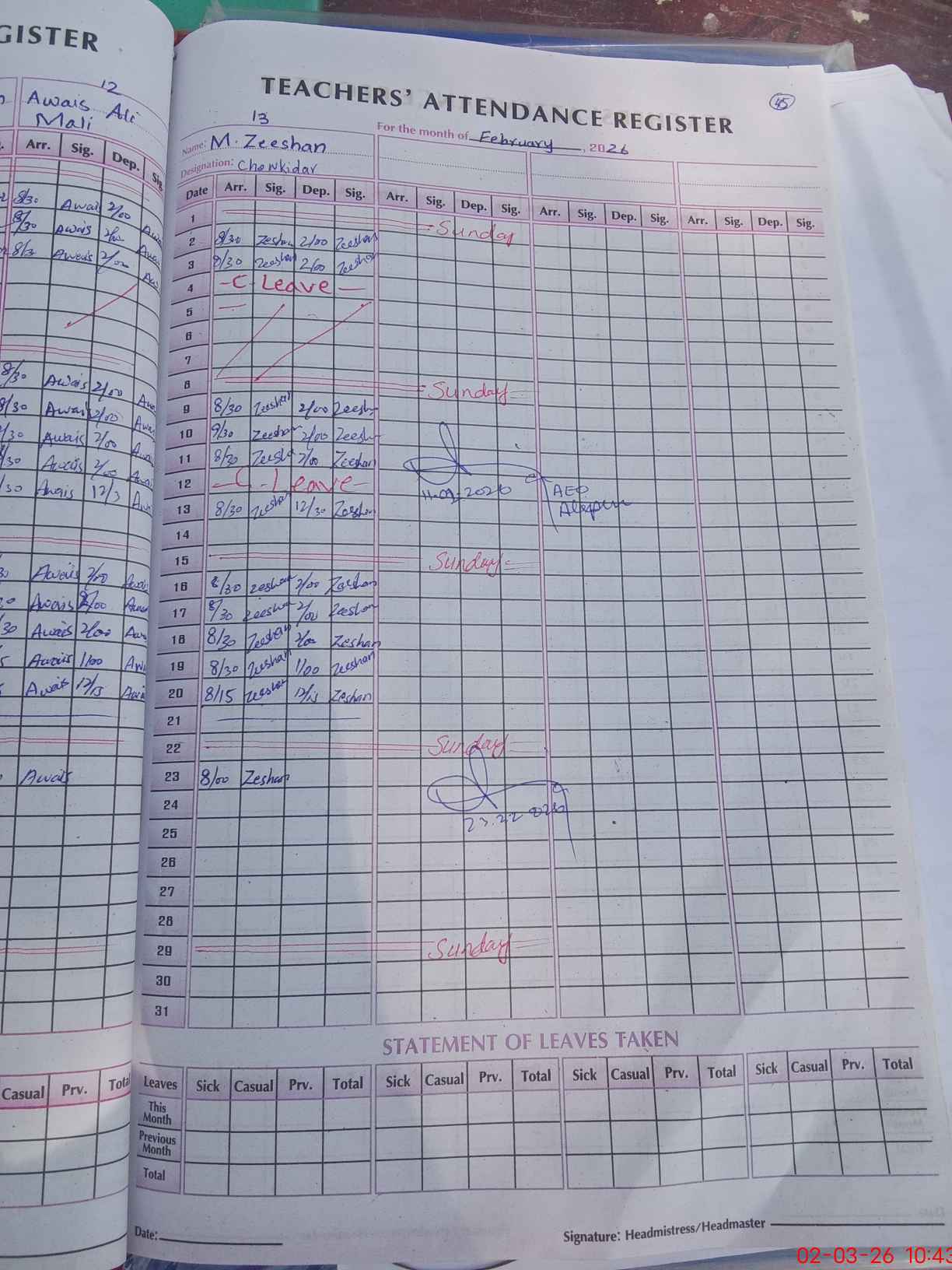 | Leave | Duty | Absent | Maternity | Medical | Ex- Pak |