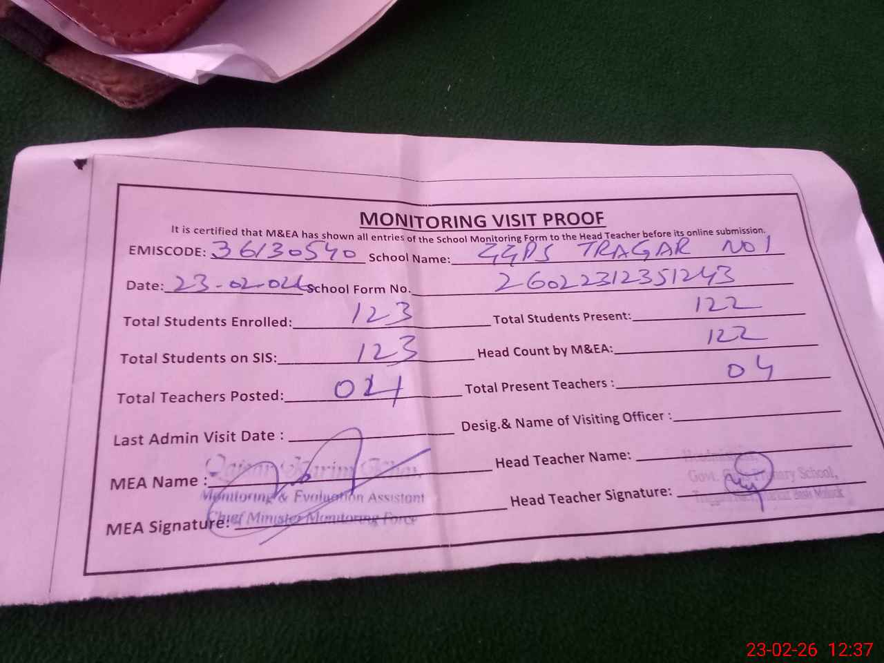 | Attendance Register | Head Teacher | MEA with School | Visit Proof |