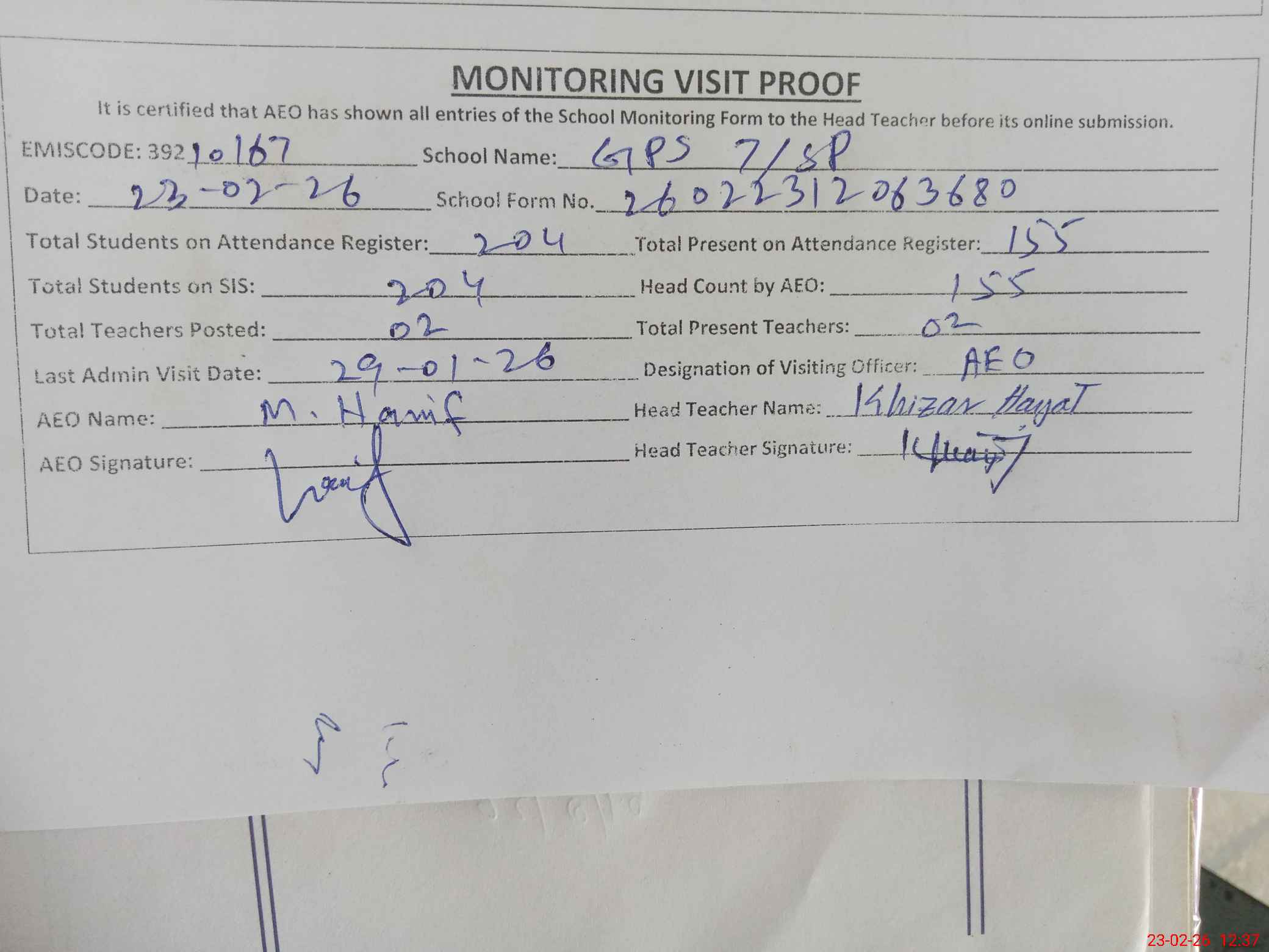 | EMIS Code: 39210167 | Name of School: GPS 7 SP PO MOLVI WALA PAKPATTAN | |||