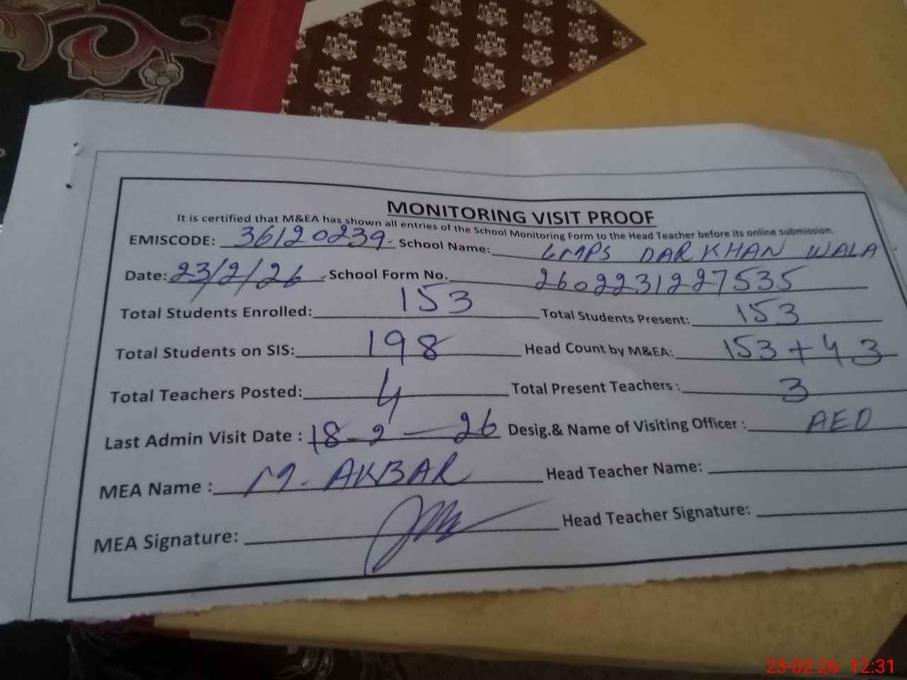 | EMIS Code: 36120239 | Name of School: GMPS DARKHAN WALA | |||