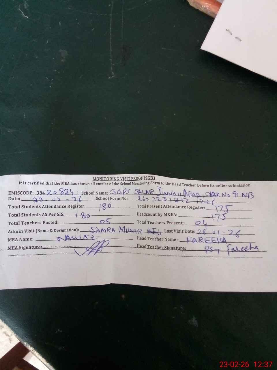 | EMIS Code: 38420824 | Name of School: GGPS SALAR JINAH ABADI CHAK NO. 91-NB | |||