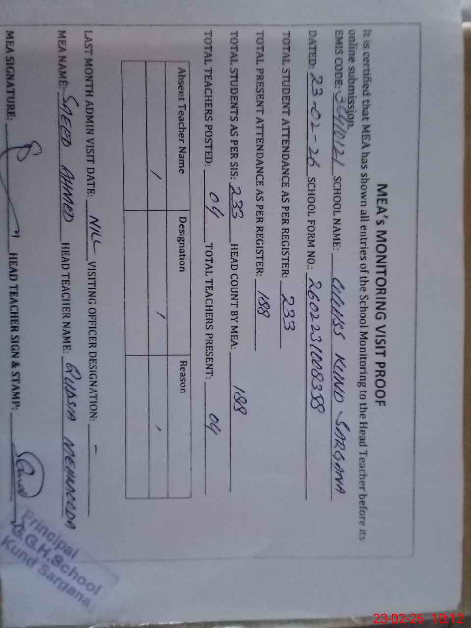 | Attendance Register | Head Teacher | MEA with School | Visit Proof |