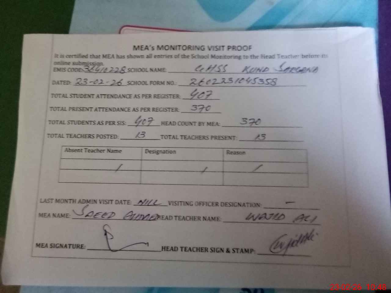 | EMIS Code: 36410228 | Name of School: GHSS KUND SARGANA, SARAI SIDHU | |||
