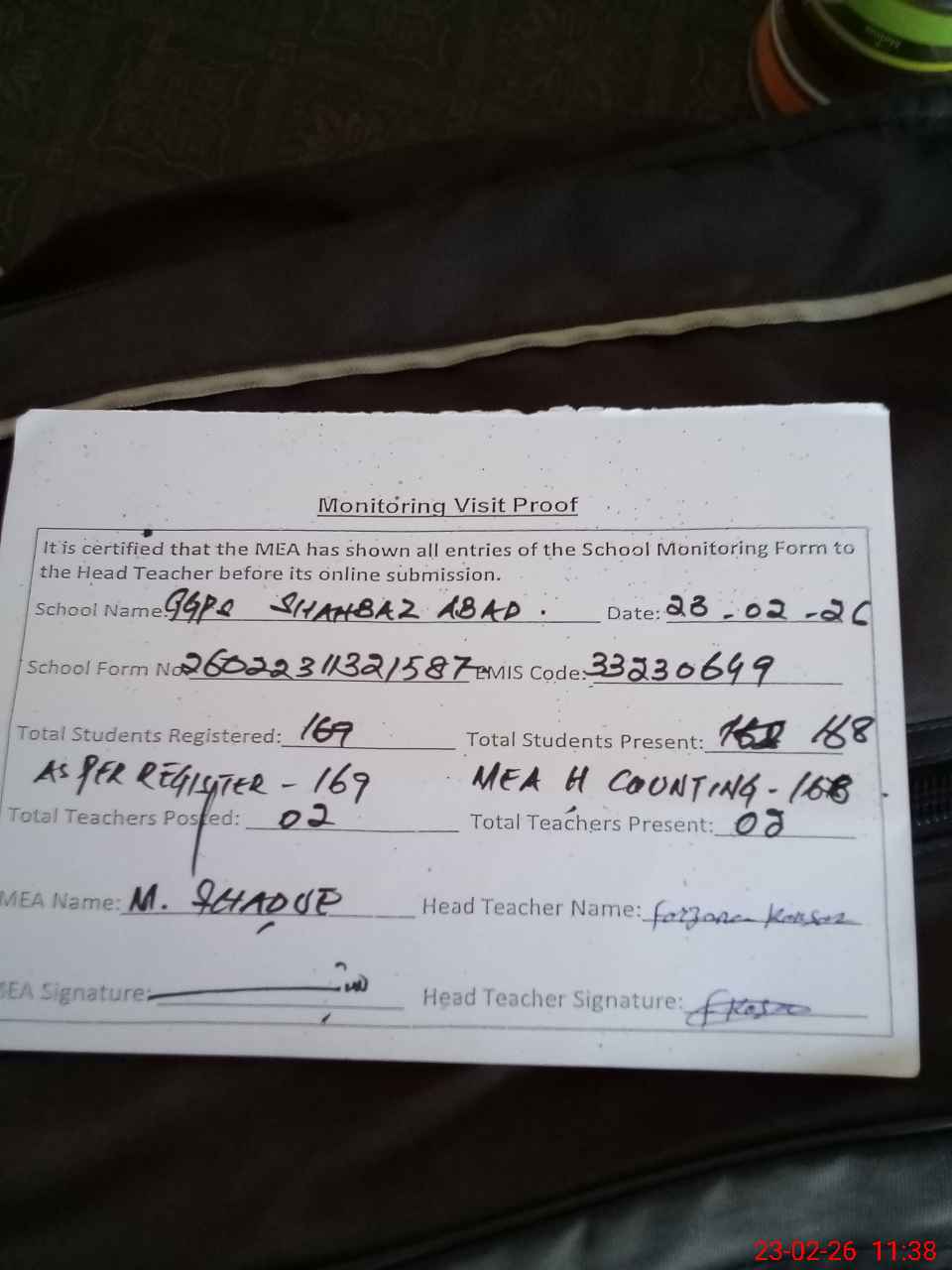 | Attendance Register | Head Teacher | MEA with School | Visit Proof |