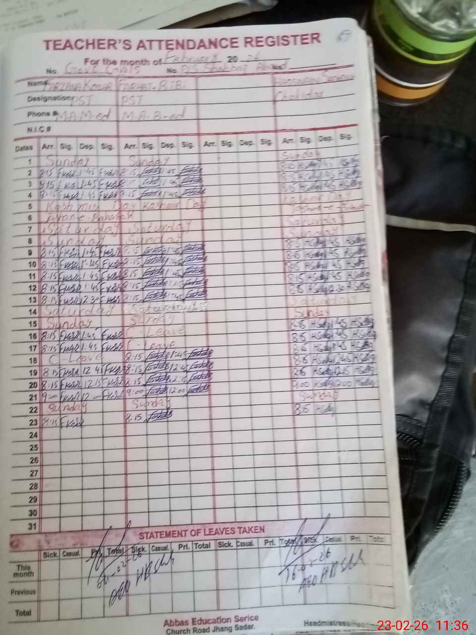 | CNIC | Full Name | Designation | R/C | Absence During Last Calender Month |