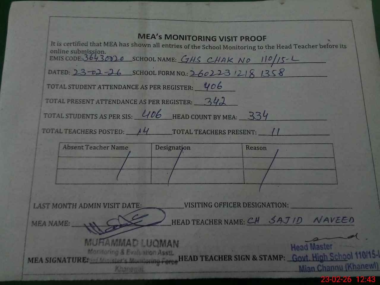 | Attendance Register | Head Teacher | MEA with School | Visit Proof |