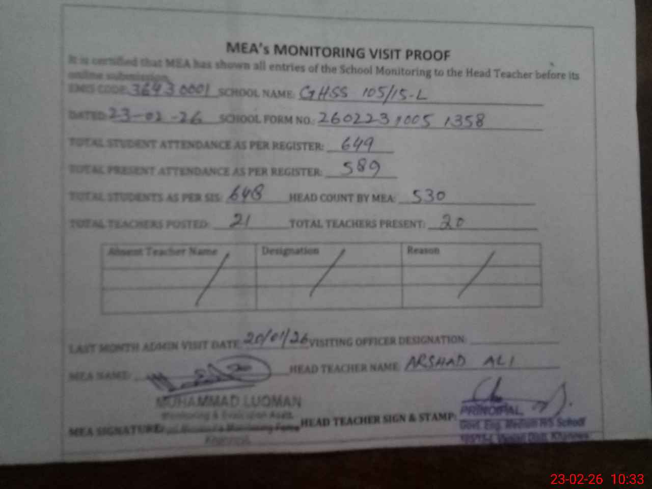 | Attendance Register | Head Teacher | MEA with School | Visit Proof |