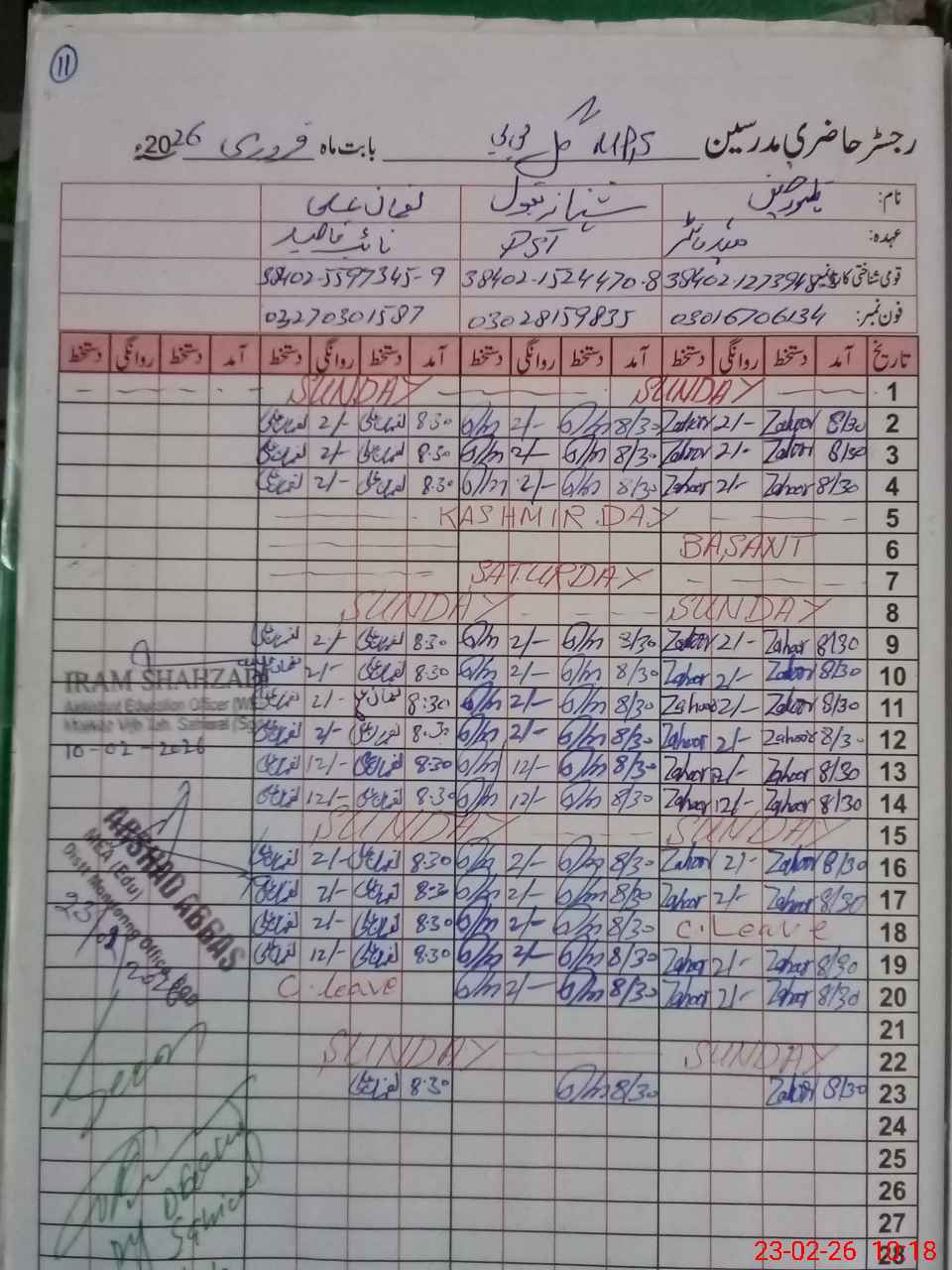 | Name: Za**** Hu**** Designation: (School Headmaster's/Headmistress's) PTC/JV Phone/Cell Number: 03**** |