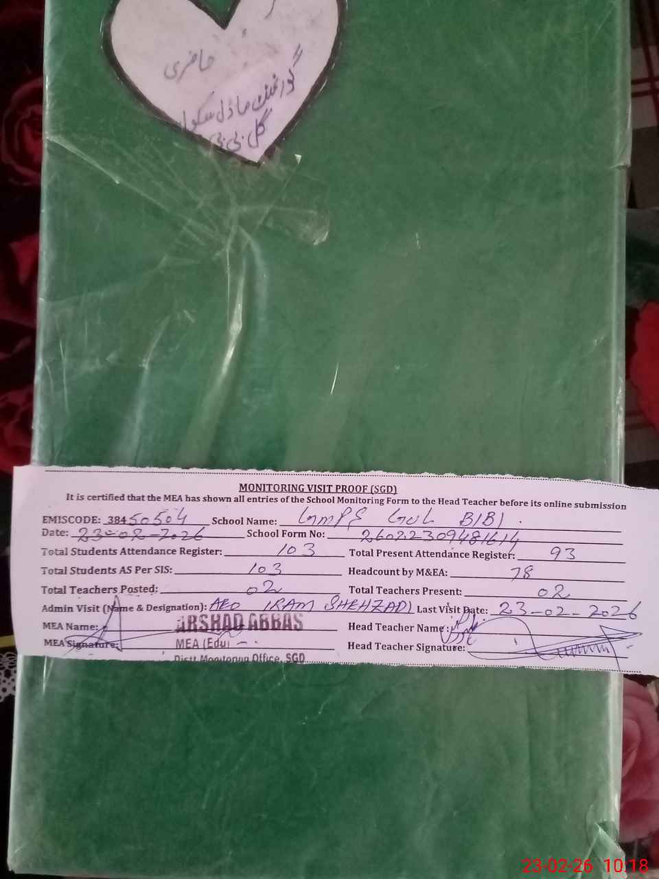 | Attendance Register | Head Teacher | MEA with School | Visit Proof |