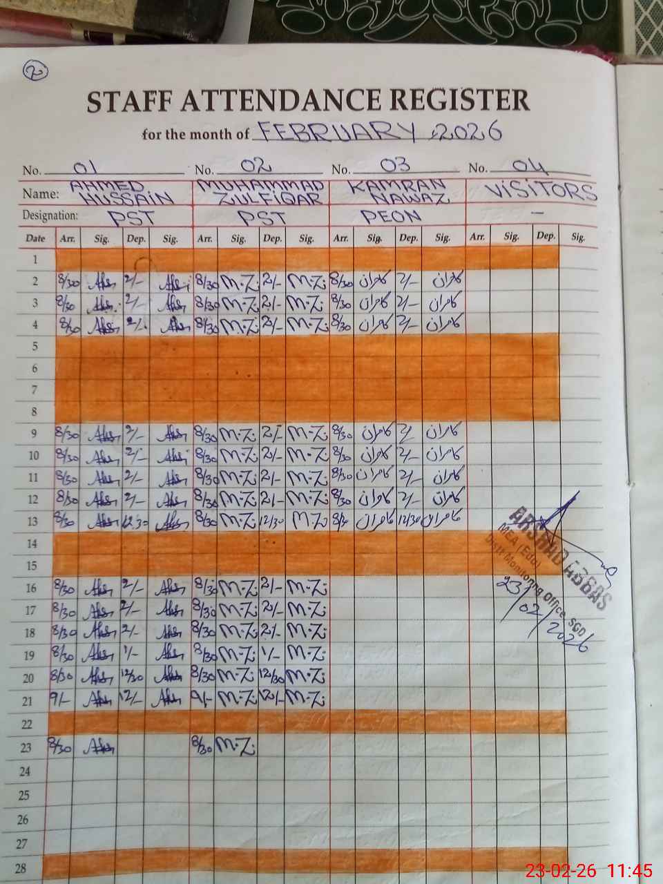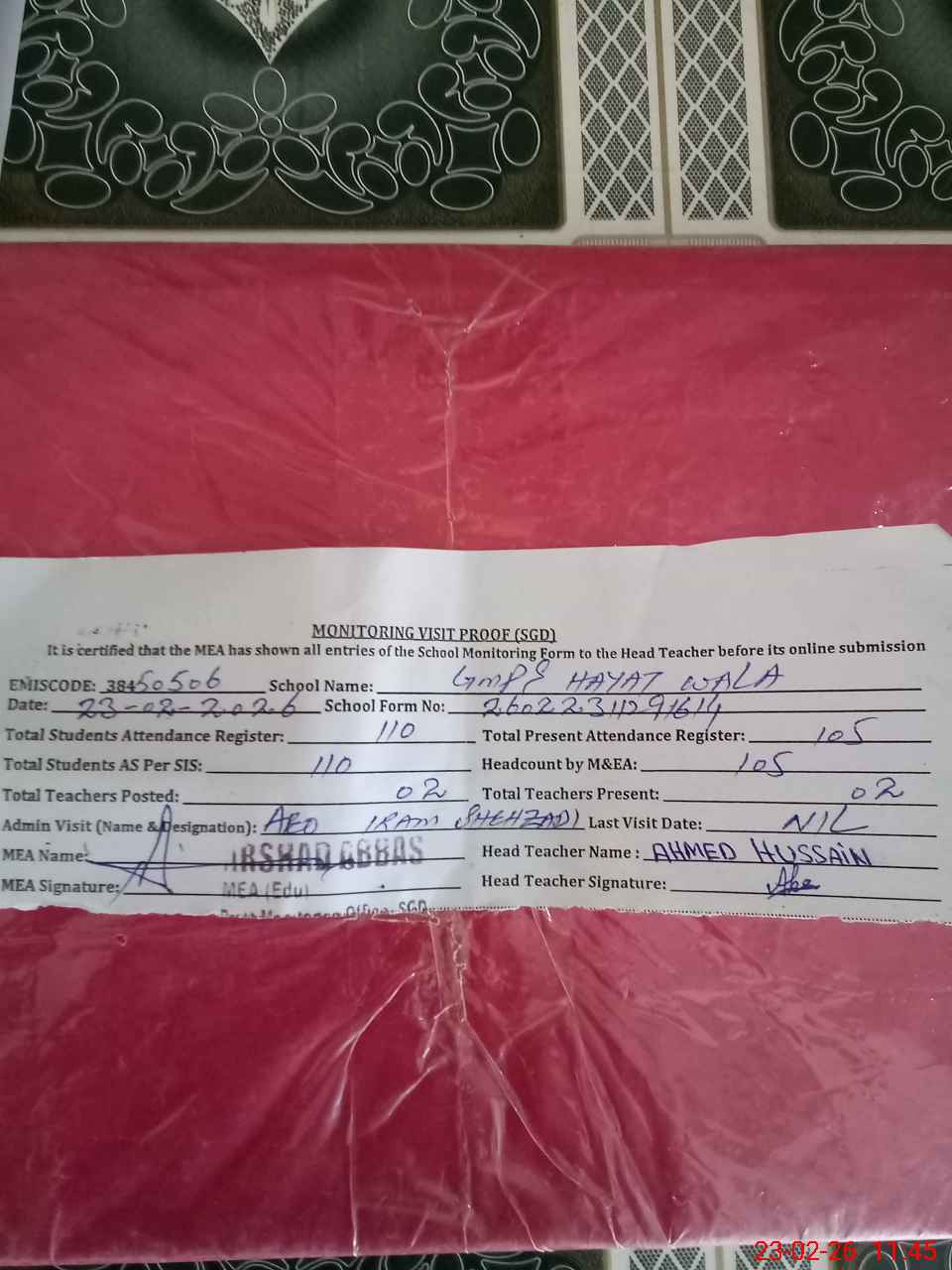 | Attendance Register | Head Teacher | MEA with School | Visit Proof |