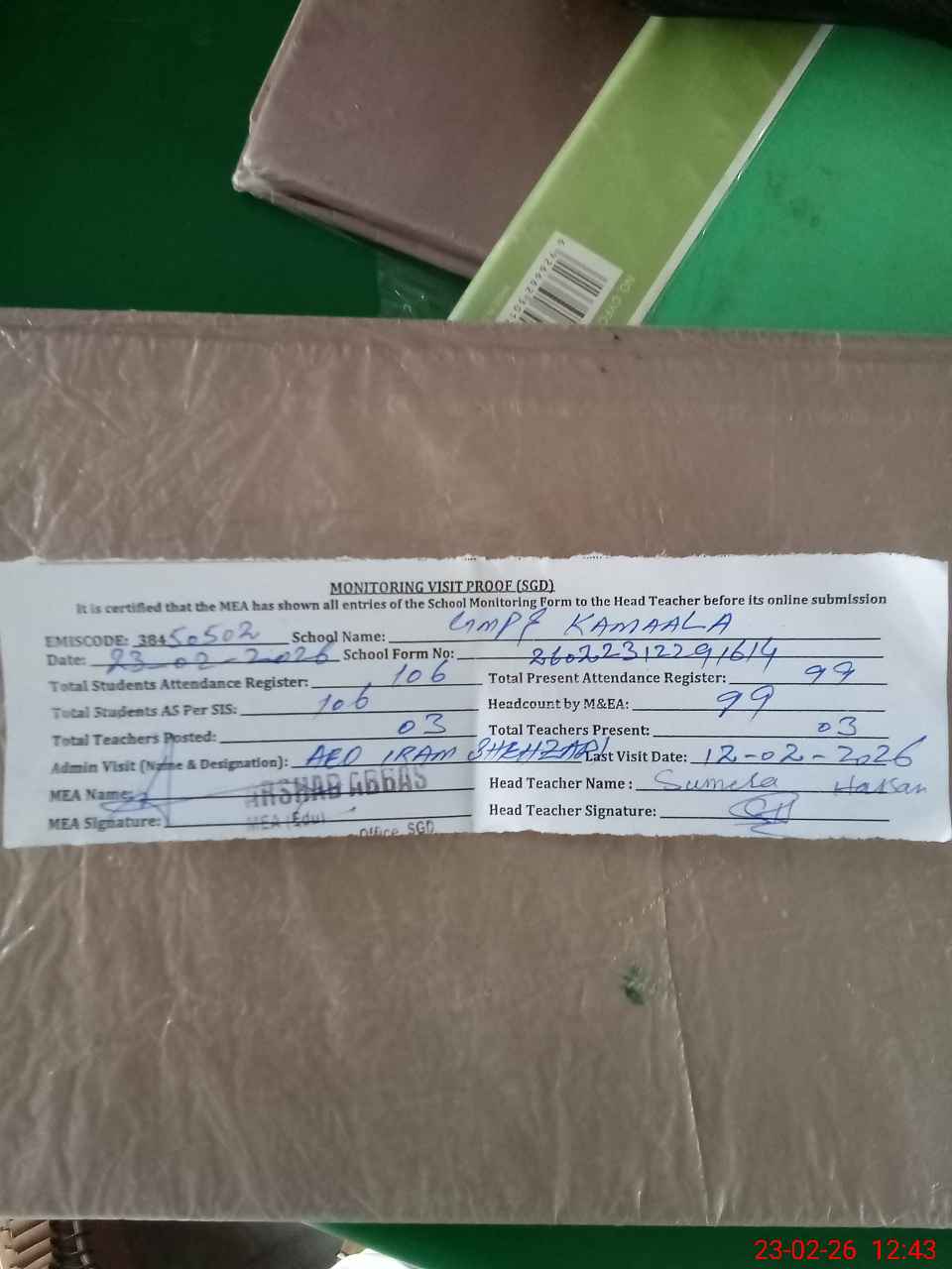 | Attendance Register | Head Teacher | MEA with School | Visit Proof |