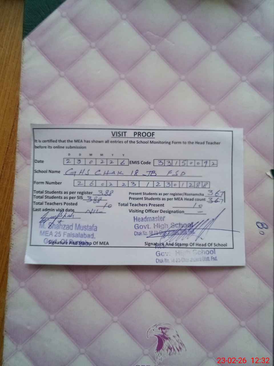 | Attendance Register | Head Teacher | MEA with School | Visit Proof |