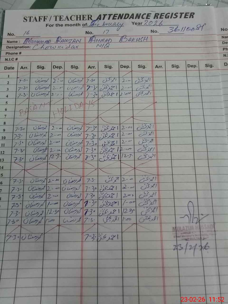 | CNIC | Full Name | Designation | R/C | Absence during last cal. month |