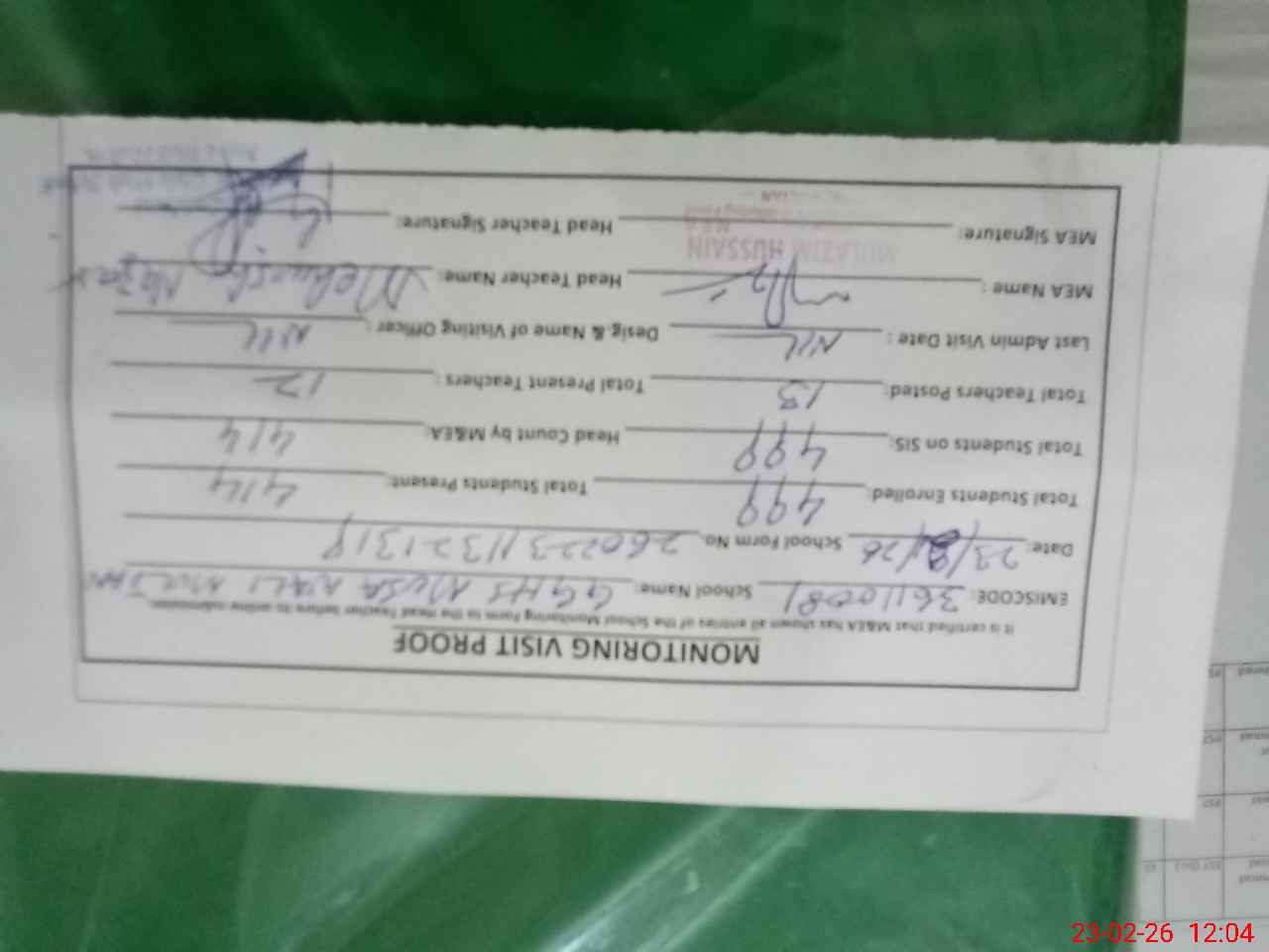 | Attendance Register | Head Teacher | MEA with School | Visit Proof |
