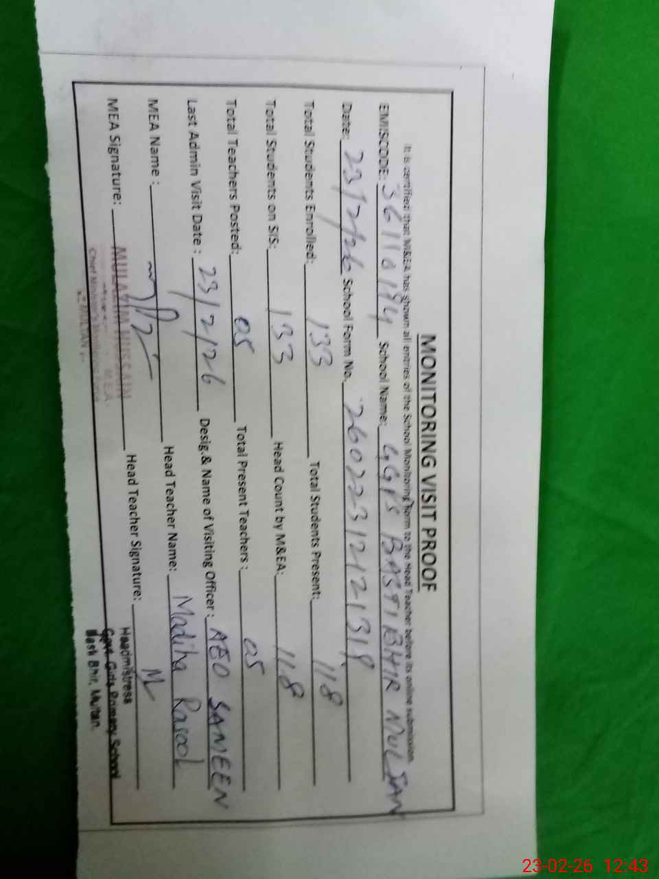 | Certified that this School was Inspected by the Undersigned MEA/DMO Today and the Information Stated Above is as Per Record. | |||||