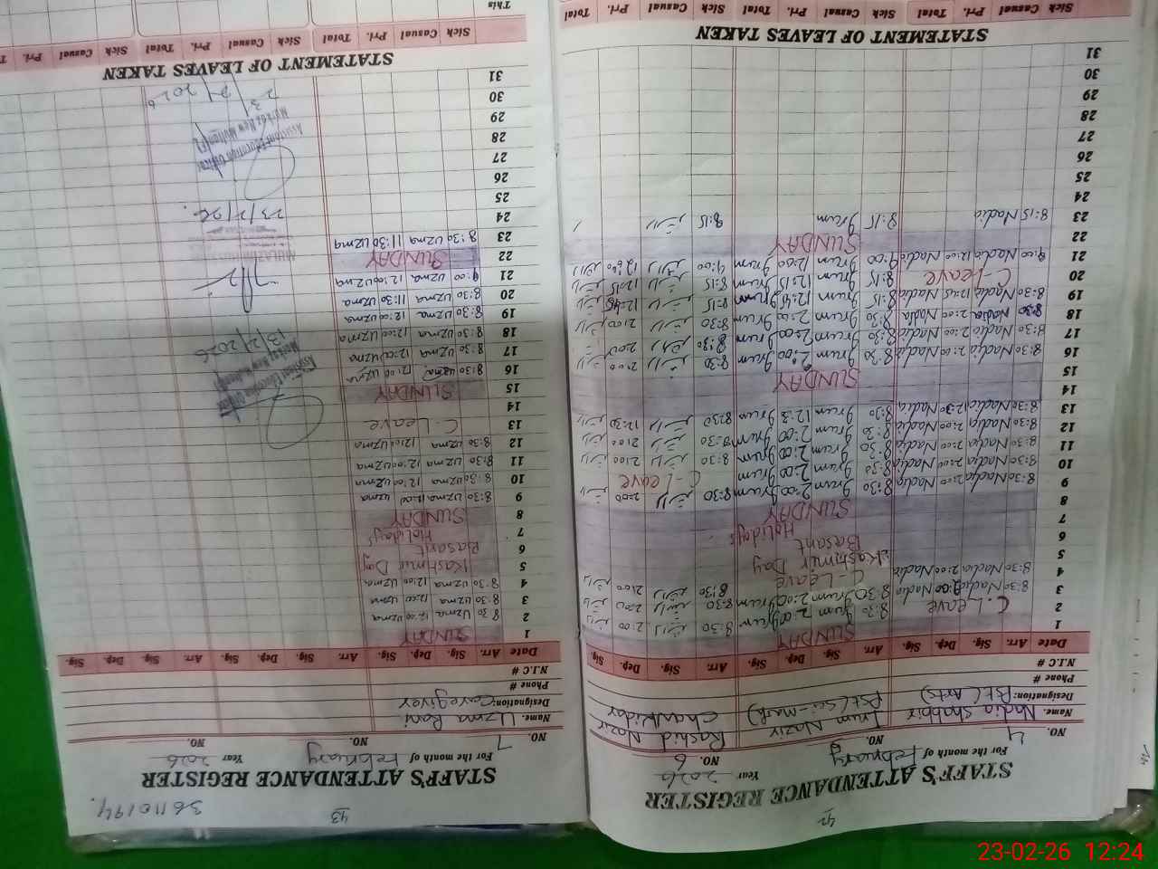 | CNIC | Full Name | Designation | R/C | Absence During Last Calender Month |
