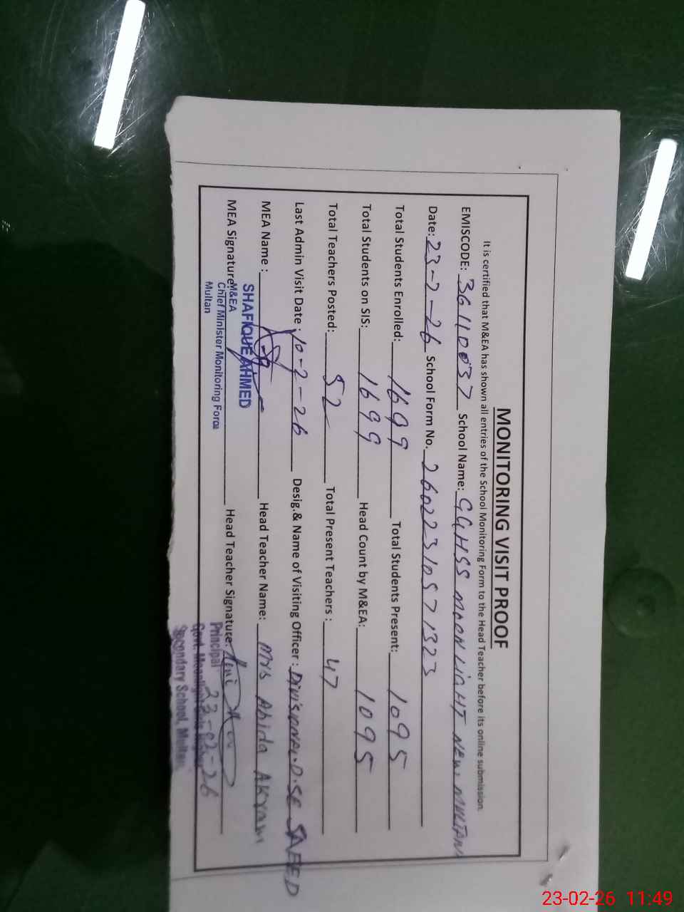 | Certified that this School was Inspected by the Undersigned MEA/DMO Today and the Information Stated Above is as Per Record. | |||||
