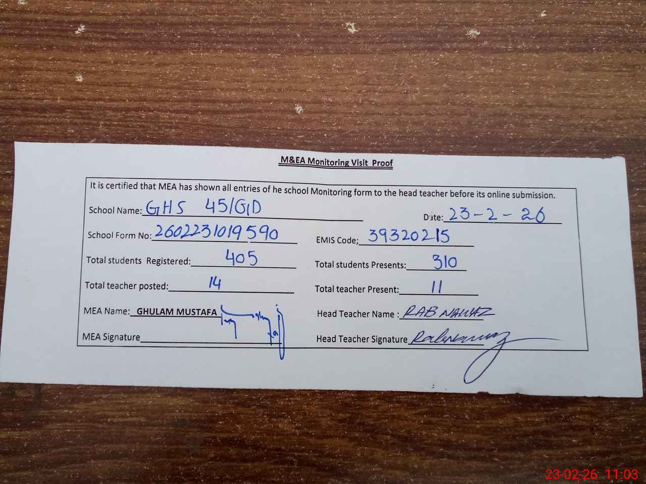 | Attendance Register | Head Teacher | MEA with School | Visit Proof |