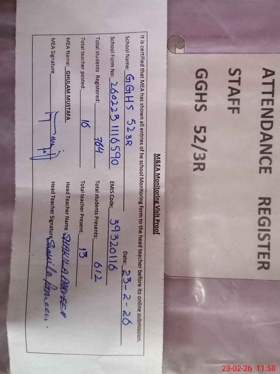 | Attendance Register | Head Teacher | MEA with School | Visit Proof |