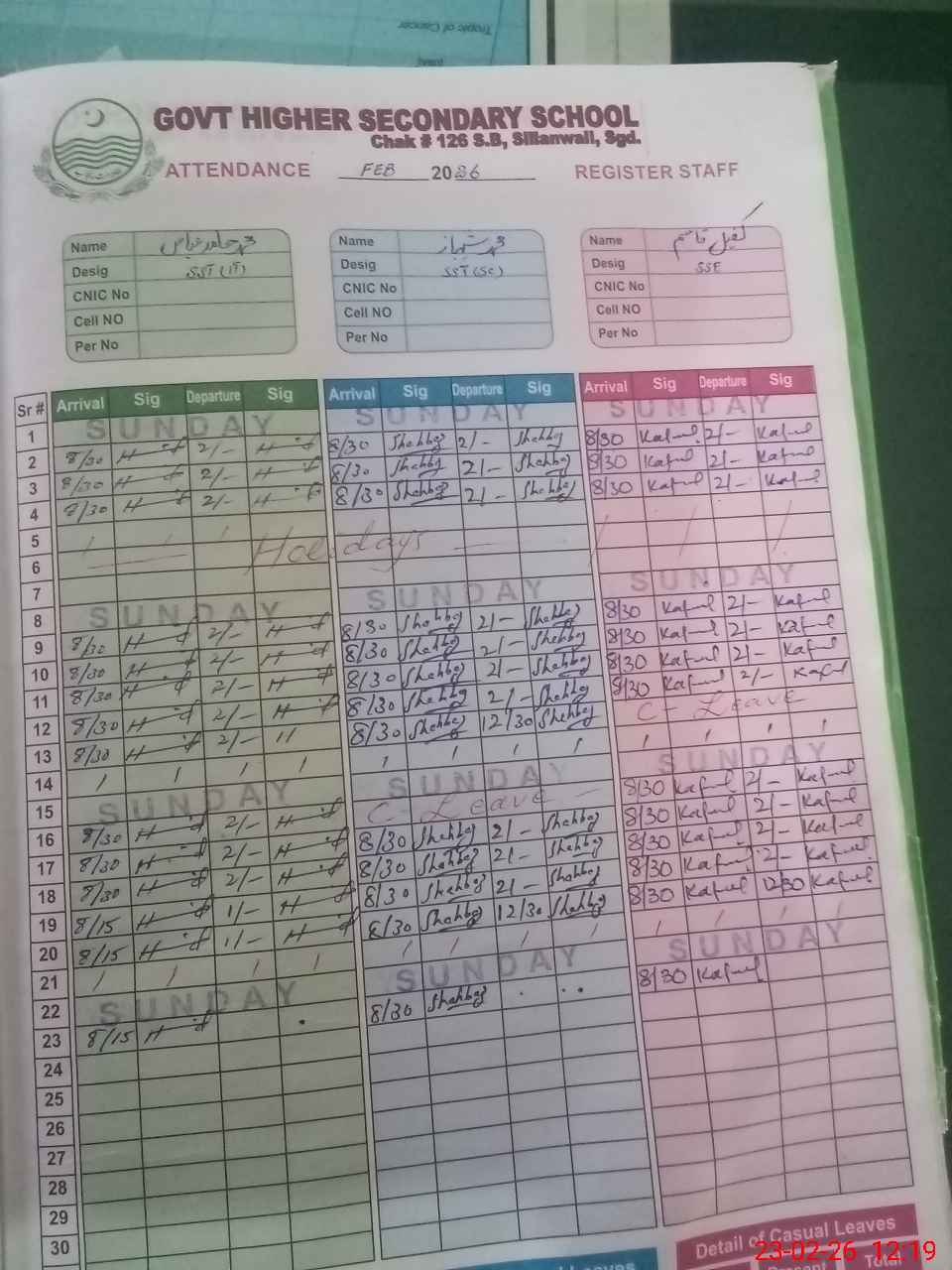 | CNIC | Full Name | Designation | R/C | Absence During Last Calender Month |