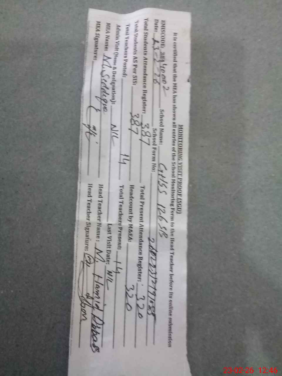 | Attendance Register | Head Teacher | MEA with School | Visit Proof |