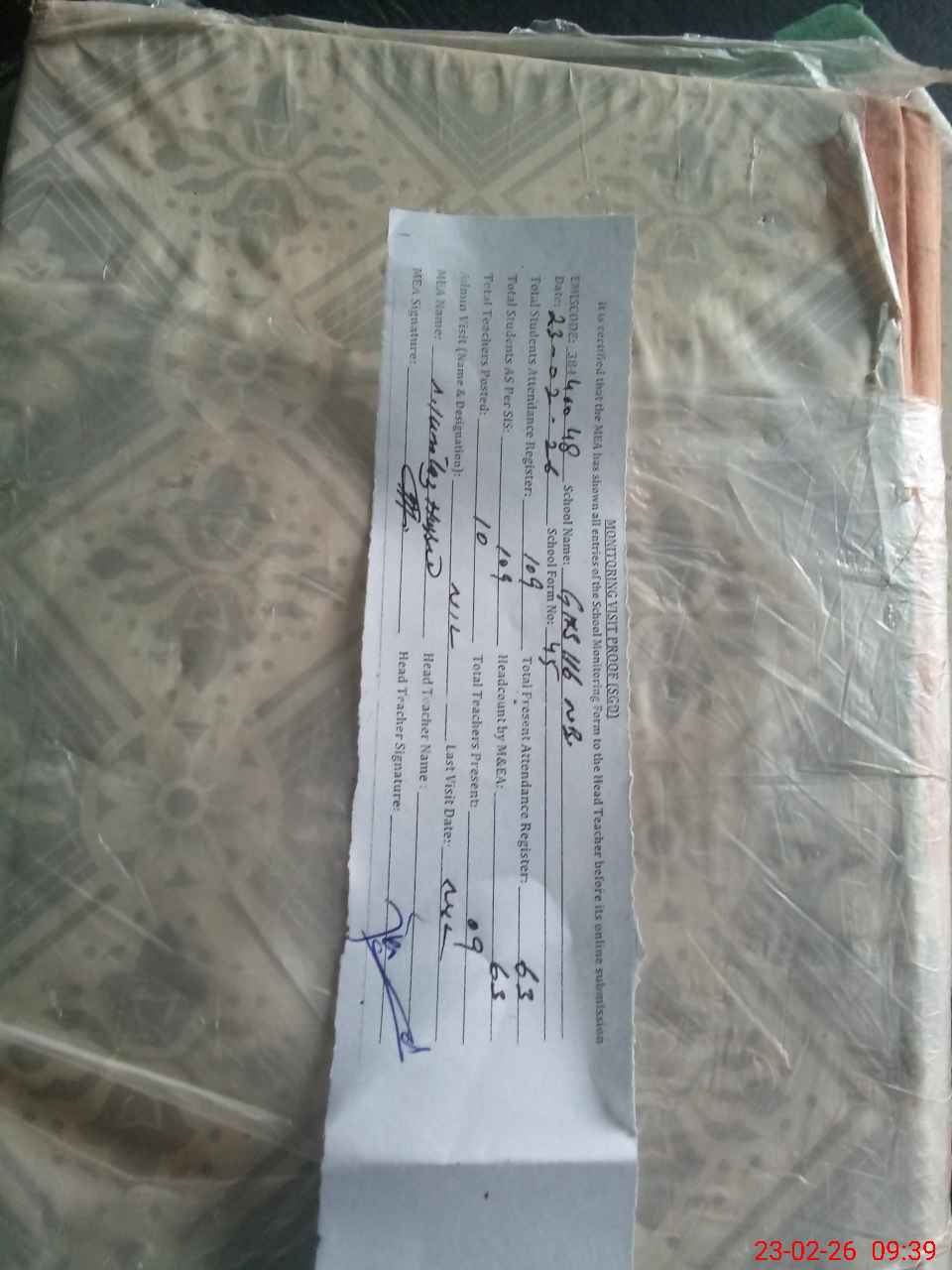 | Attendance Register | Head Teacher | MEA with School | Visit Proof |