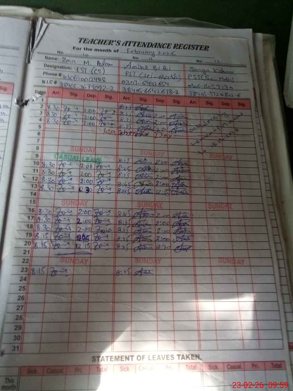 | 38**** | Sa**** Ki**** | PST Science/Maths | Regular | 12 | 0 | 0 | 12 | 0 | 0 | 0 | 0 | 0 | Maternity |