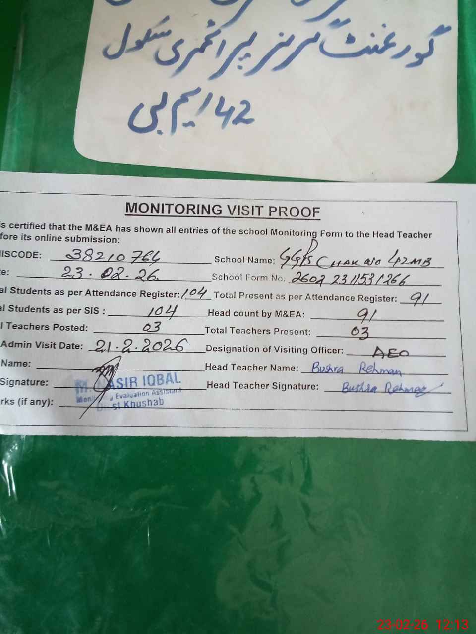 | EMIS Code: 38210764 | Name of School: GGPS CHAK NO 42 MB | |||