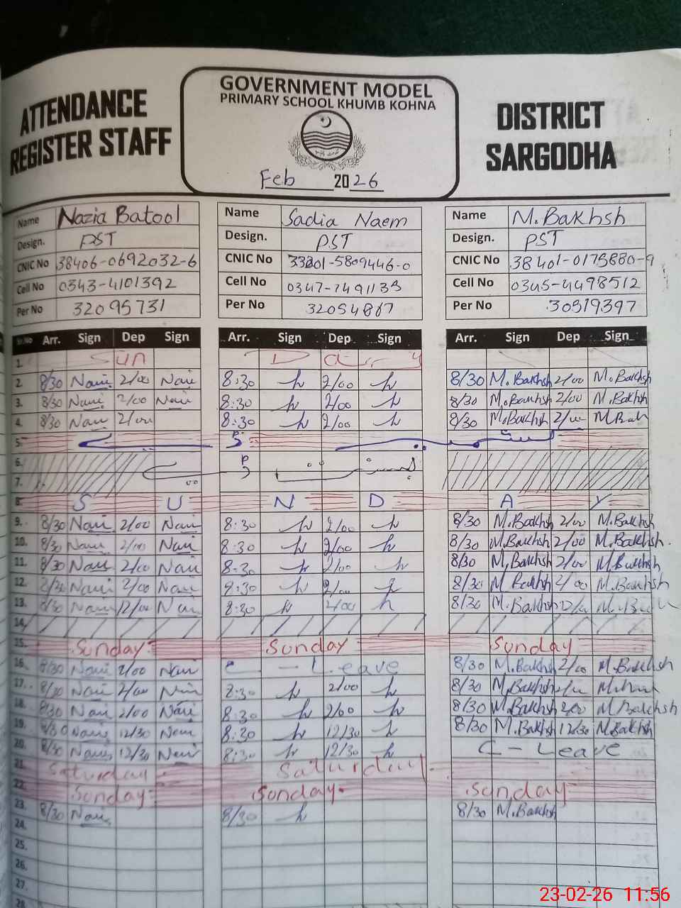 | CNIC | Full Name | Designation | R/C | Absence During Last Calender Month |