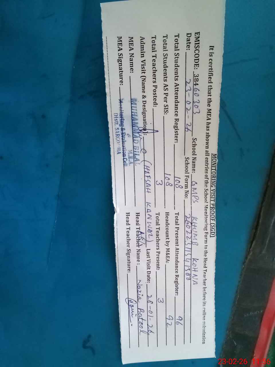 | Attendance Register | Head Teacher | MEA with School | Visit Proof |