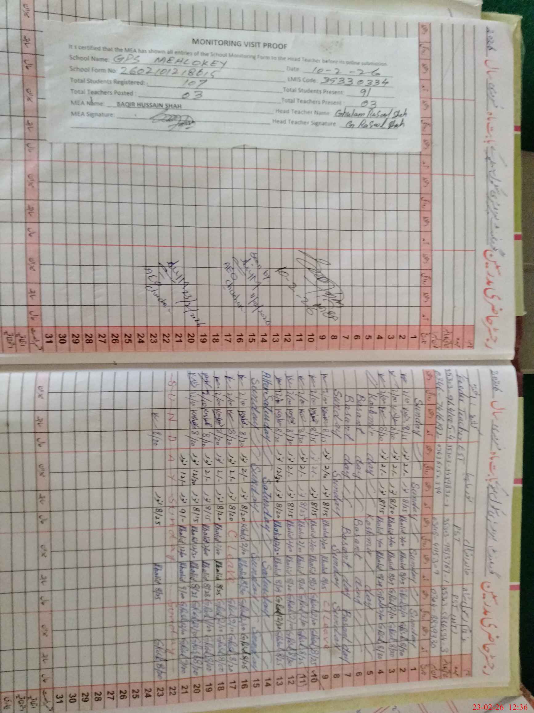 | Attendance Register | Head Teacher | MEA with School | Visit Proof |