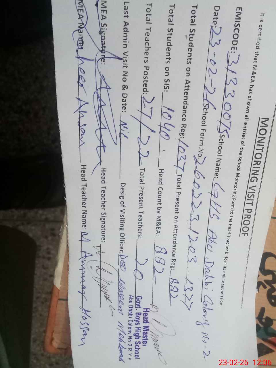 | EMIS Code: 31330075 | Name of School: GHS ABU DAHBI COLONY NO. 2 | |||