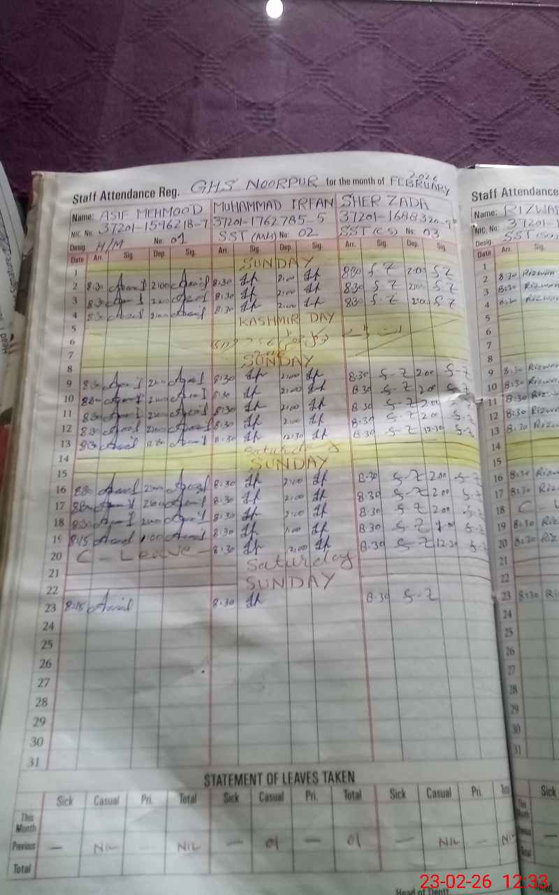 | CNIC | Full Name | Designation | R/C | Absence During Last Calender Month |