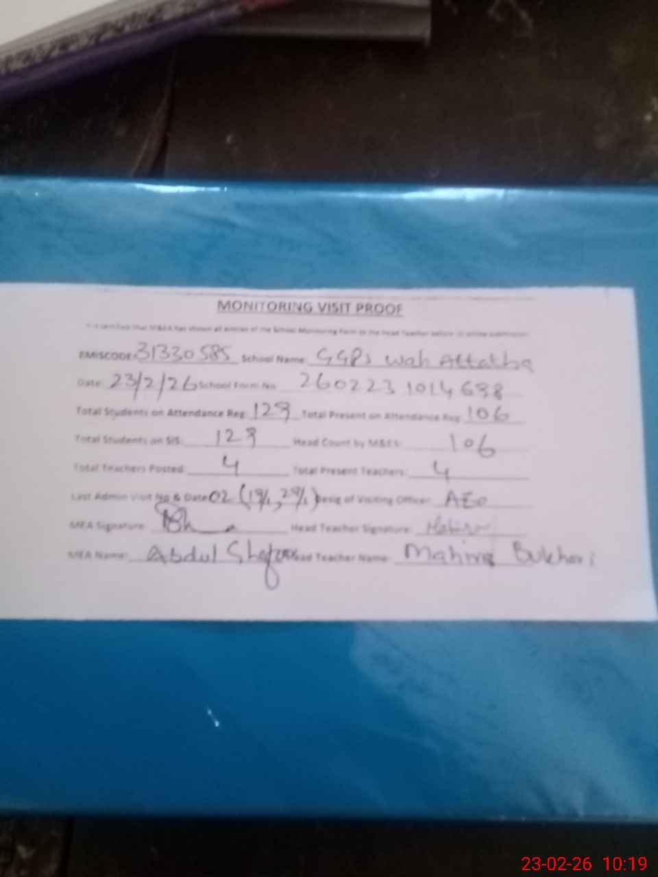 | Attendance Register | Head Teacher | MEA with School | Visit Proof |
