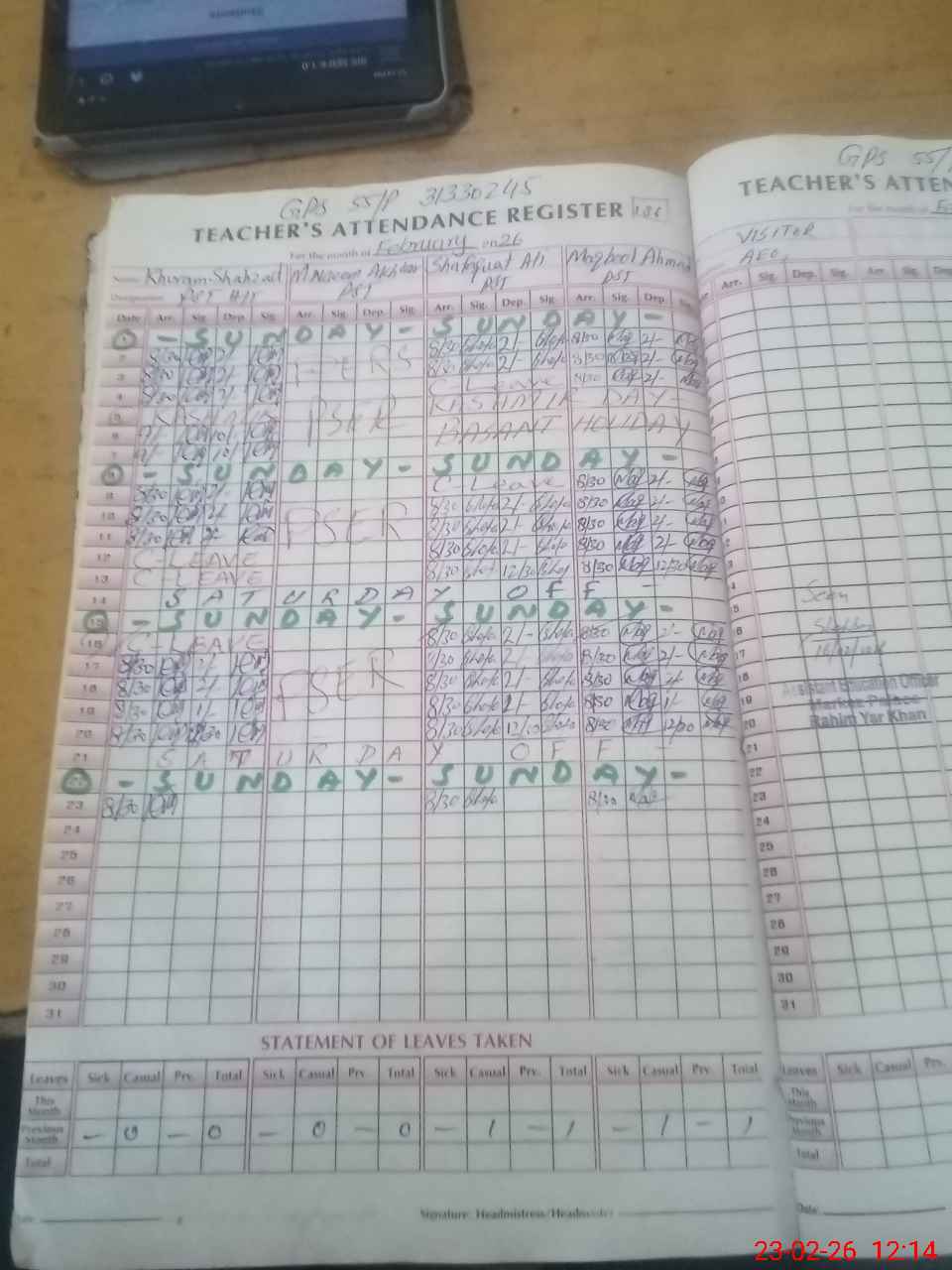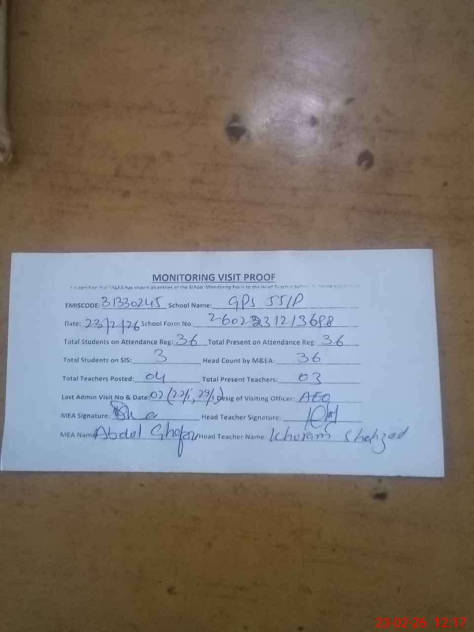 | Attendance Register | Head Teacher | MEA with School | Visit Proof |