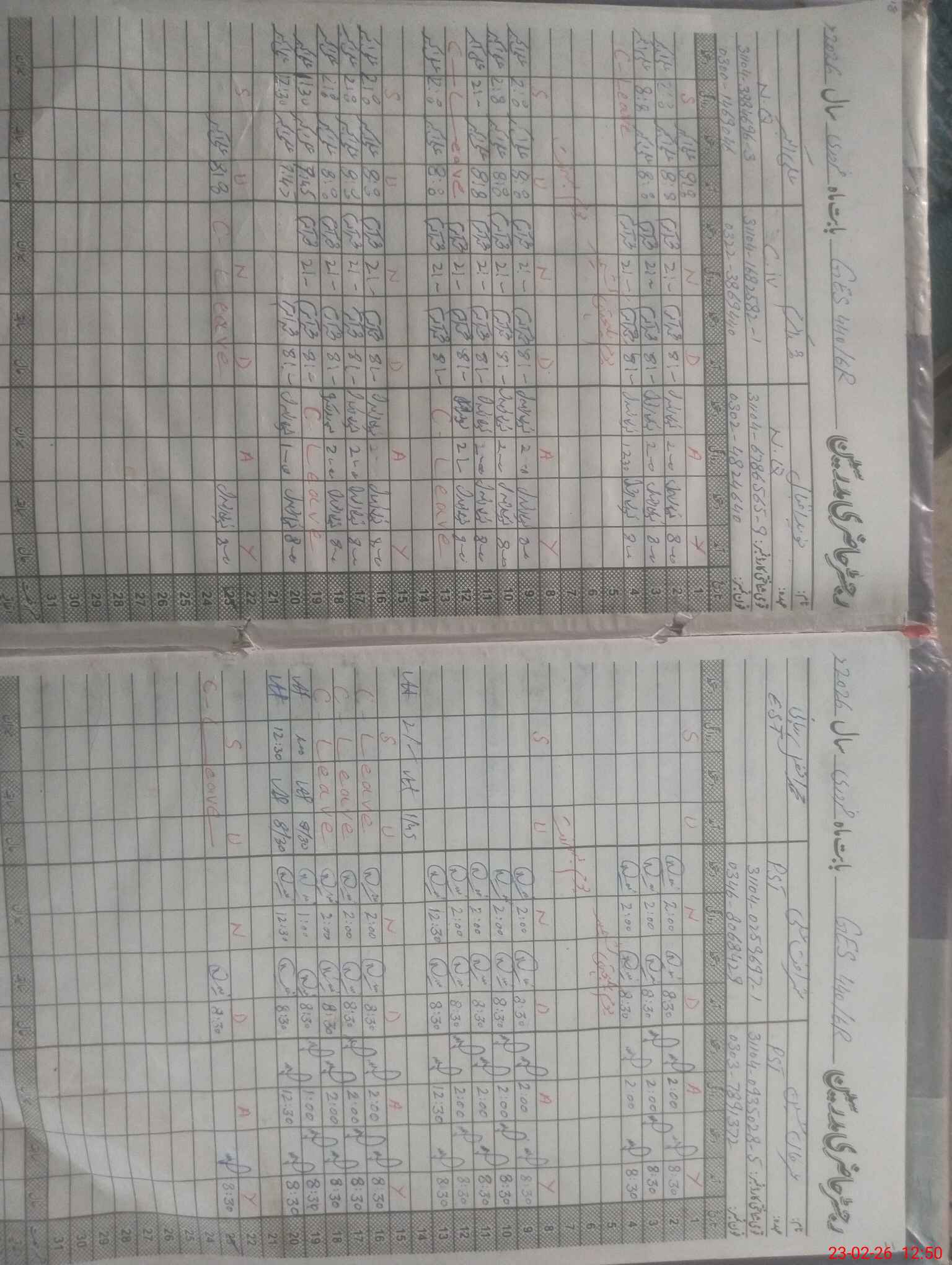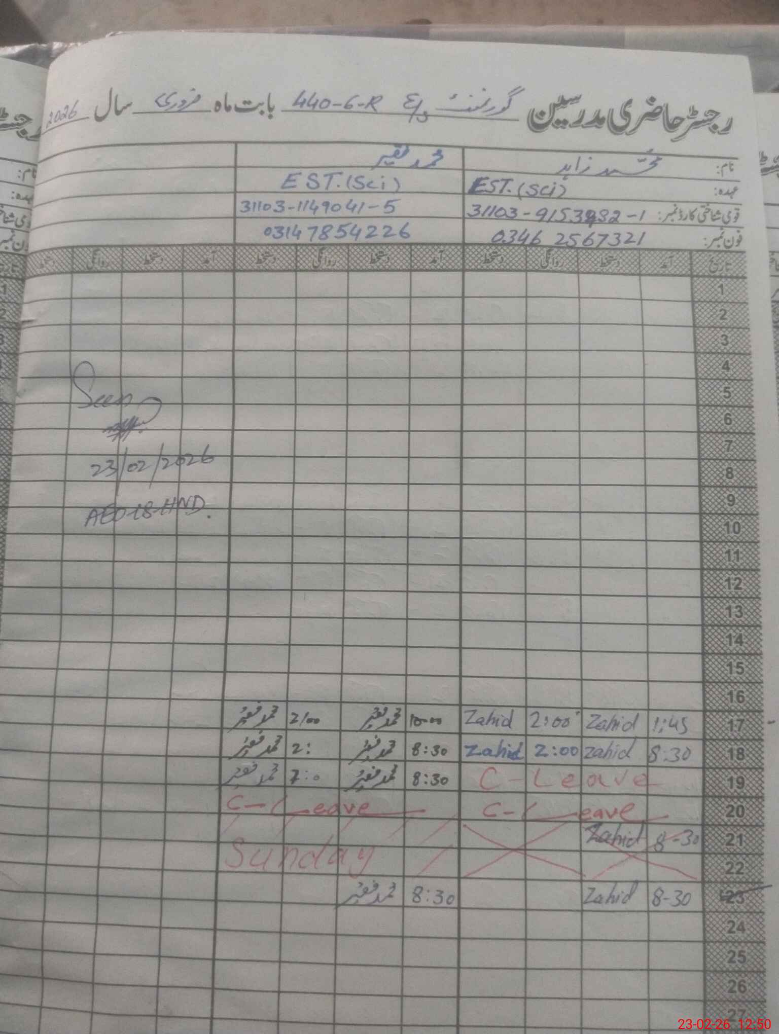 | CNIC | Full Name | Designation | R/C | Absence During Last Calender Month |