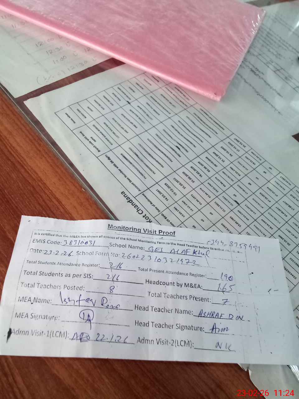 | Attendance Register | Head Teacher | MEA with School | Visit Proof |