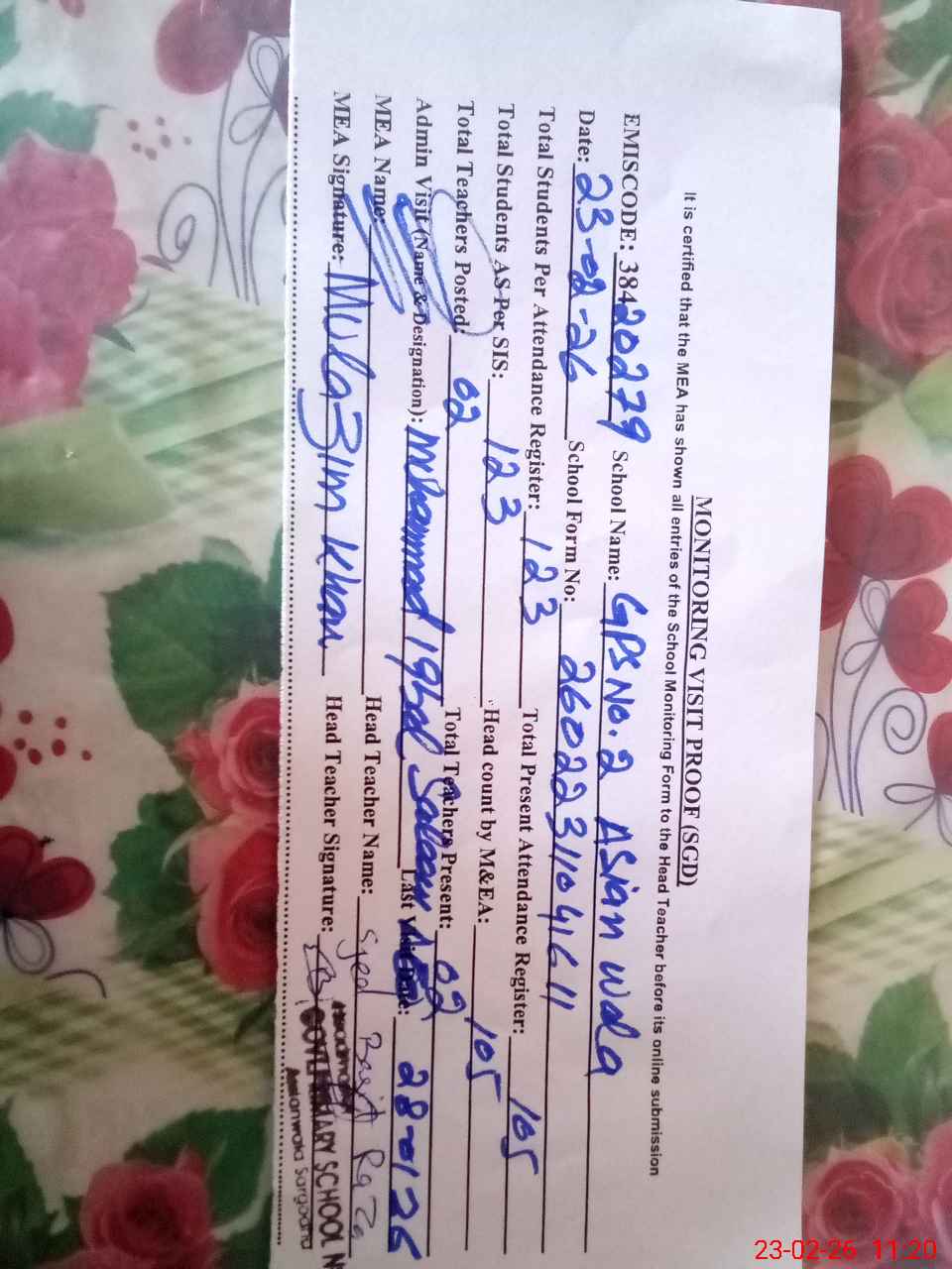 | EMIS Code: 38420279 | Name of School: GPS NO.2 ASIAN WALA | |||