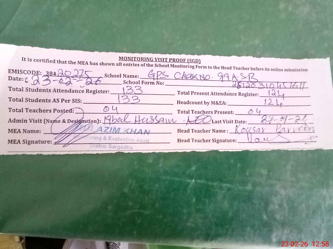 | EMIS Code: 38420275 | Name of School: GPS CHAK NO.99 A-SB | |||