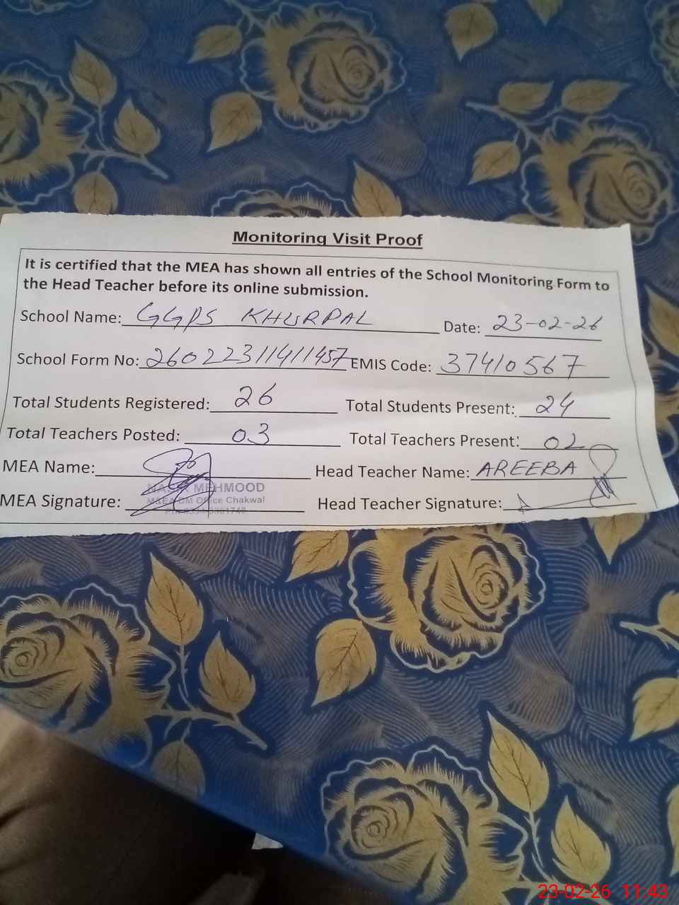 | Attendance Register | Head Teacher | MEA with School | Visit Proof |