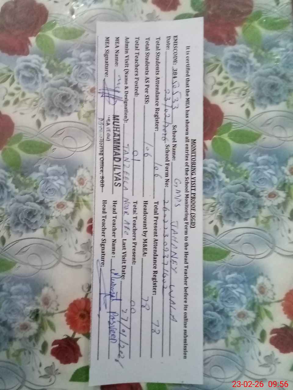 | Attendance Register | Head Teacher | MEA with School | Visit Proof |