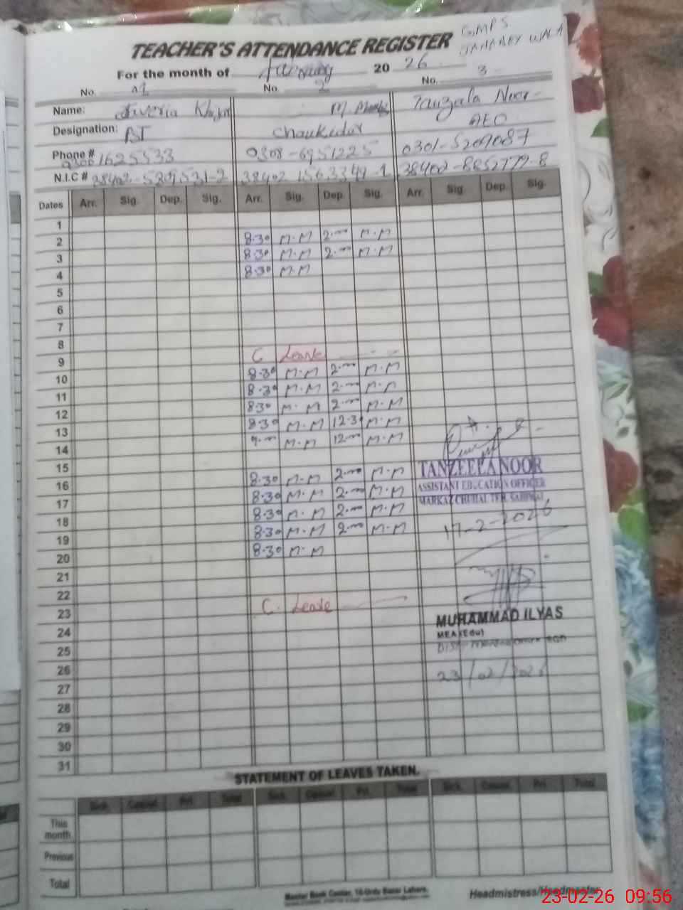 | Remarks (Use Separate Page if Required): JAWERIA KHIZAR PST CNIC NO 3840258095312 WAS UN AUTHORIZED ABSENT HOWEVER 02 NSB TEACHERS ARE PRESENT IN SCHOOL MUHAMMAD MUMTAZ CHOWKIDAR CNIC NO 3840215633491 WAS ATTACHED IN SCHOOL AND WAS UN AUTHORIZED ABSENT NSB AND FTF ACCOUNTS WERE NOT UPDATED TEXTBOOKS RECORD WAS NOT AVAILABLE | |||||