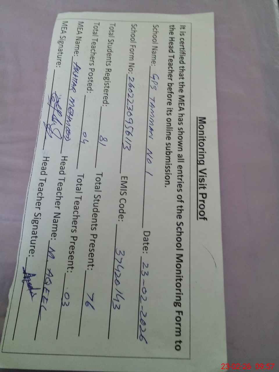 | Attendance Register | Head Teacher | MEA with School | Visit Proof |