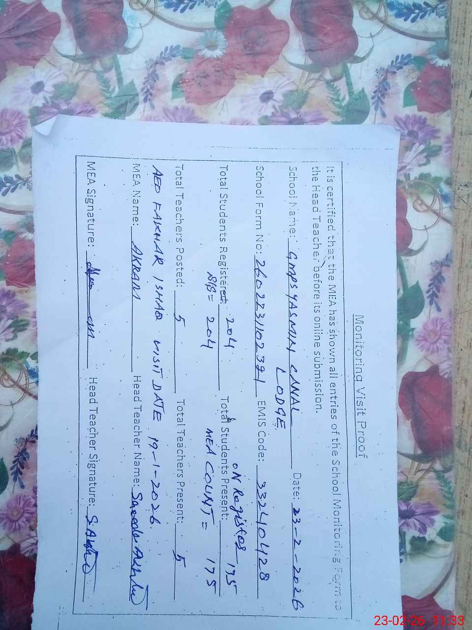 | Attendance Register | Head Teacher | MEA with School | Visit Proof |
