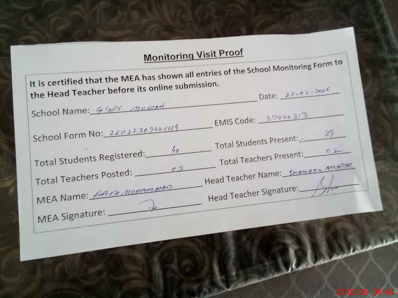 | Attendance Register | Head Teacher | MEA with School | Visit Proof |